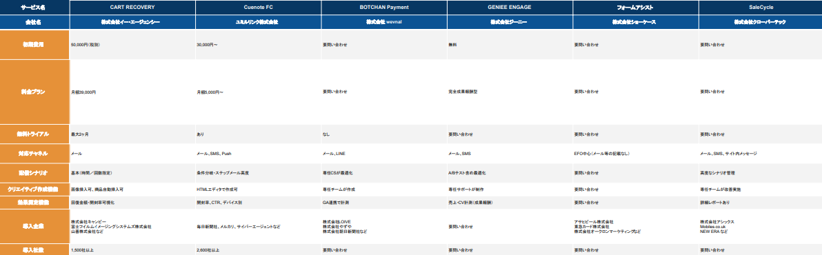 記事でも紹介したように、カゴ落ち対策ツールといっても、ユーザーへのリマインド通知や決済フォーム改善など、特化しているポイントがそれぞれ異なります。