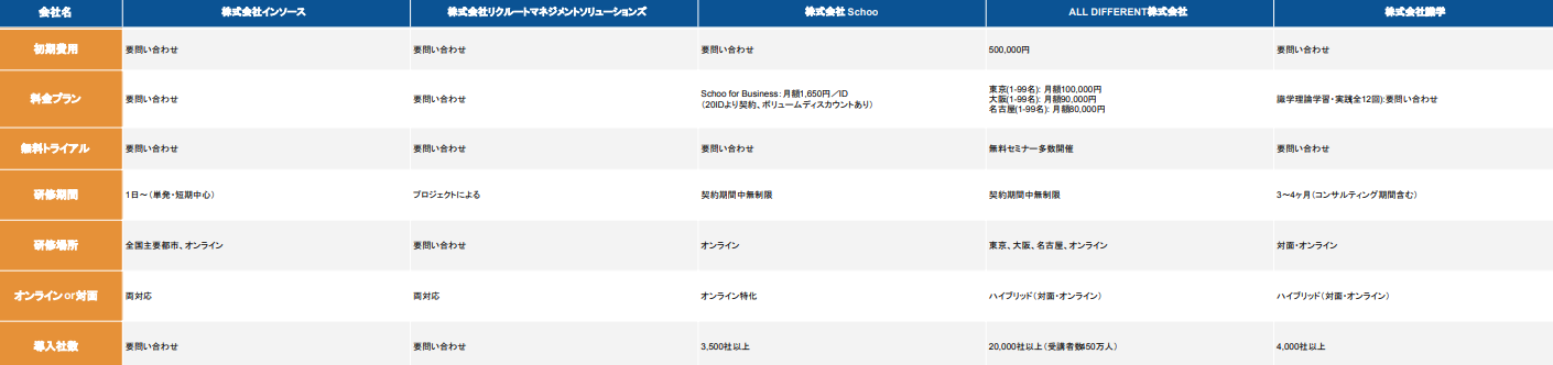 | 料金プラン | ビジネススキル研修: 360,000円/名 現場マネジメント研修: 185,000円/名 など |
