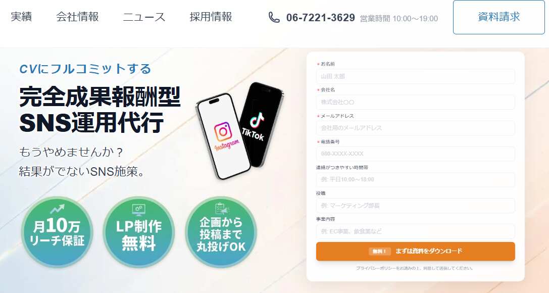 | 主なサービス内容 | ・SNSアカウント戦略設計 ・SNS運用代行 ・SNS広告運用 ・レポート・効果検証 ・インフルエンサー施策 |